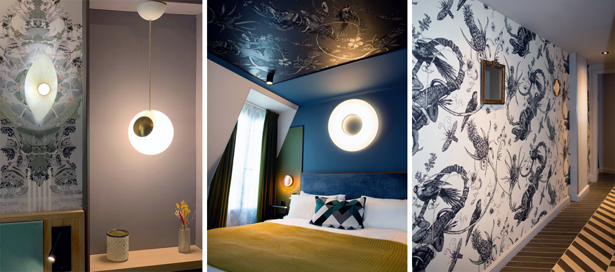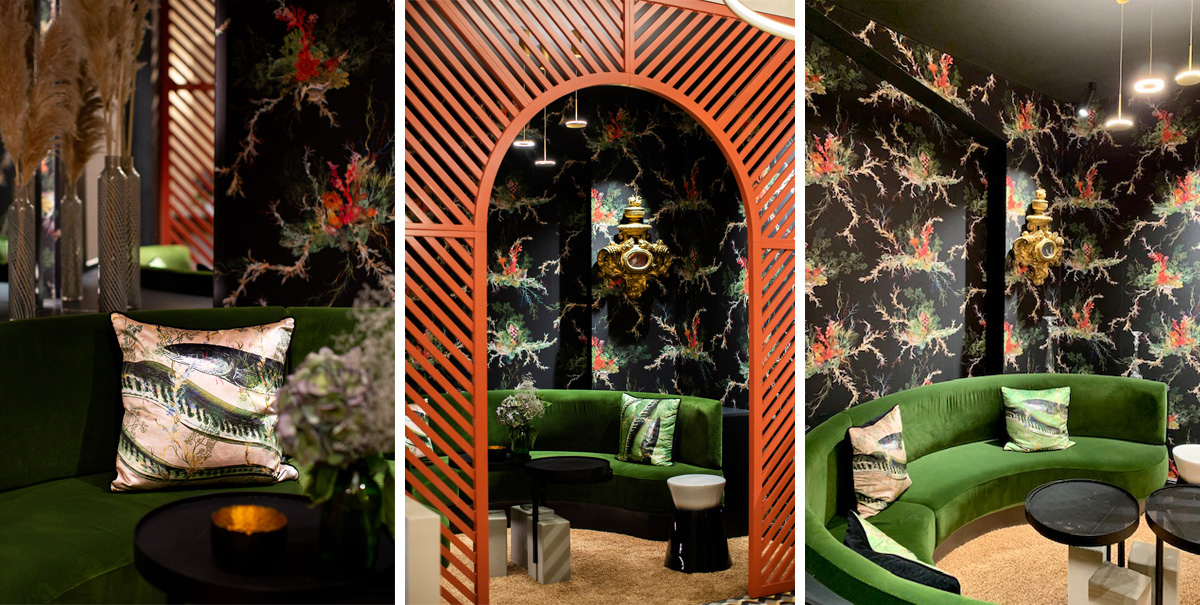 The hotel namesake playfully comes from the Parisian tale of Madame de Maintenon raising the illegitimate children of Louis XIV where the boutique hotel now stands, and the sincere warmth of a real family home is something the hotel were keen to nurture within their interior design. Our Seaweed and Shell Soft Touch wallpaper creates a dramatic feature in the hotel lobby, paired with our Eel Velvet cushions.