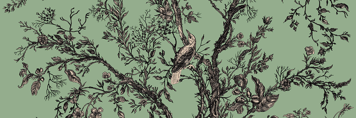 Golden Oriole showcases swirls of knotted tree branches with it’s namesake bird perched at the centre, screen-printed in opulent gold and black inks upon a series of soft matte Superwide wallpapers.