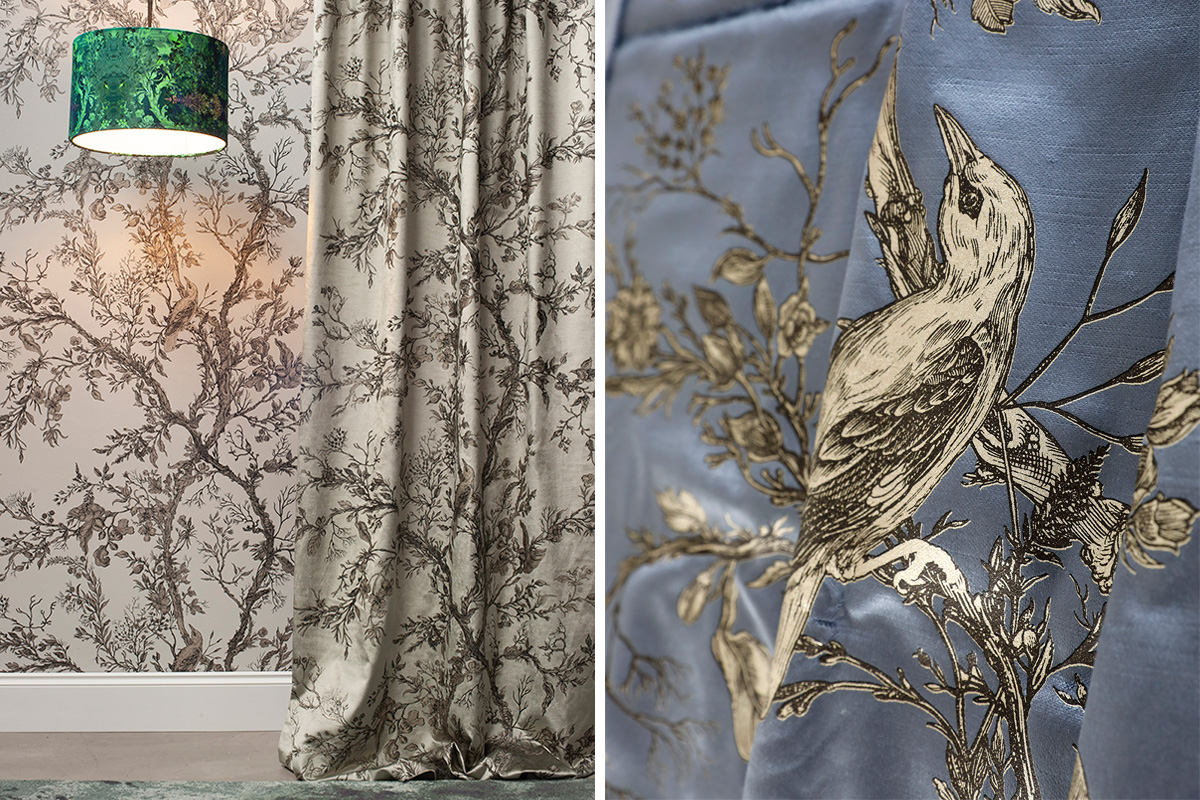 Complementing the wallpaper, Timorous Beasties are also adding a further three colourways of Golden Oriole on decadent cotton velvet: Sage, Pewter and Beige. Screenprinted using traditional methods and craftsmanship, the velvet is suitable for drapery and light upholstery.