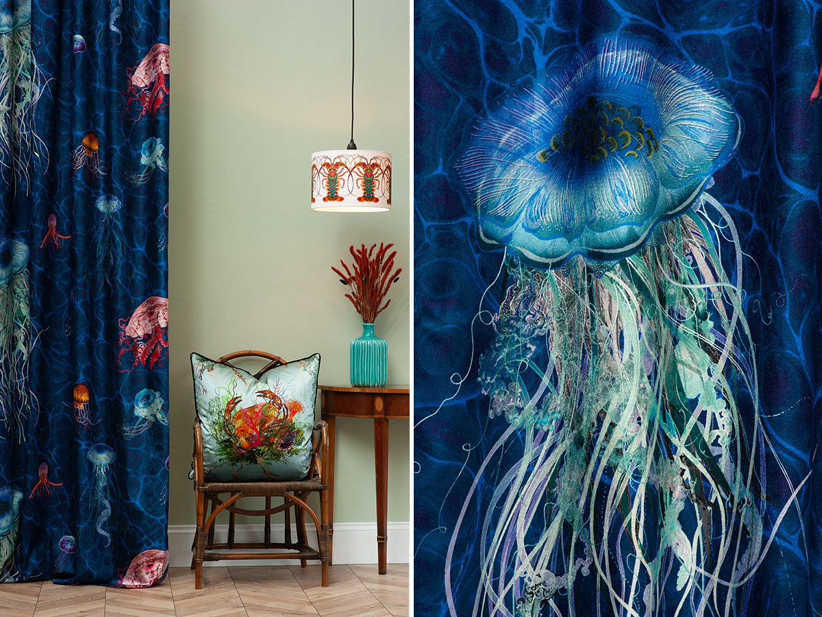 The new Jellyfish fabric utilises an innovative printing process that brings depth and realism to the design. The hand-drawn image is digitally printed onto the fabric and the velvet finish creates an underwater-like glow. The scale of the repeat pattern gives a sense of being immersed in a tank surrounded by floating marine life.