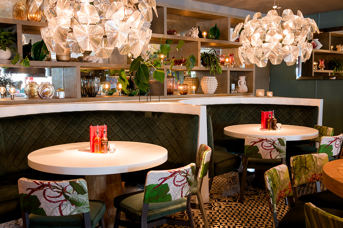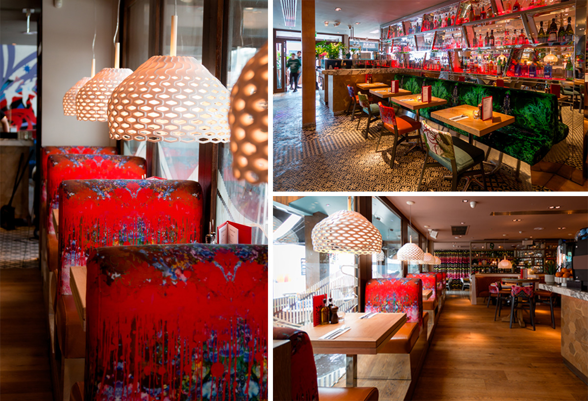 A selection of Timorous Beasties fabrics were selected to compliment the relaxed, Mediterranean feel of the dining space including Topical Tropical upholstery, Tourmaline Damask booth seating, Zig Zag Moth drapery and a bespoke Thunder Blotch awning beautifully framing the exterior of the restaurant.
