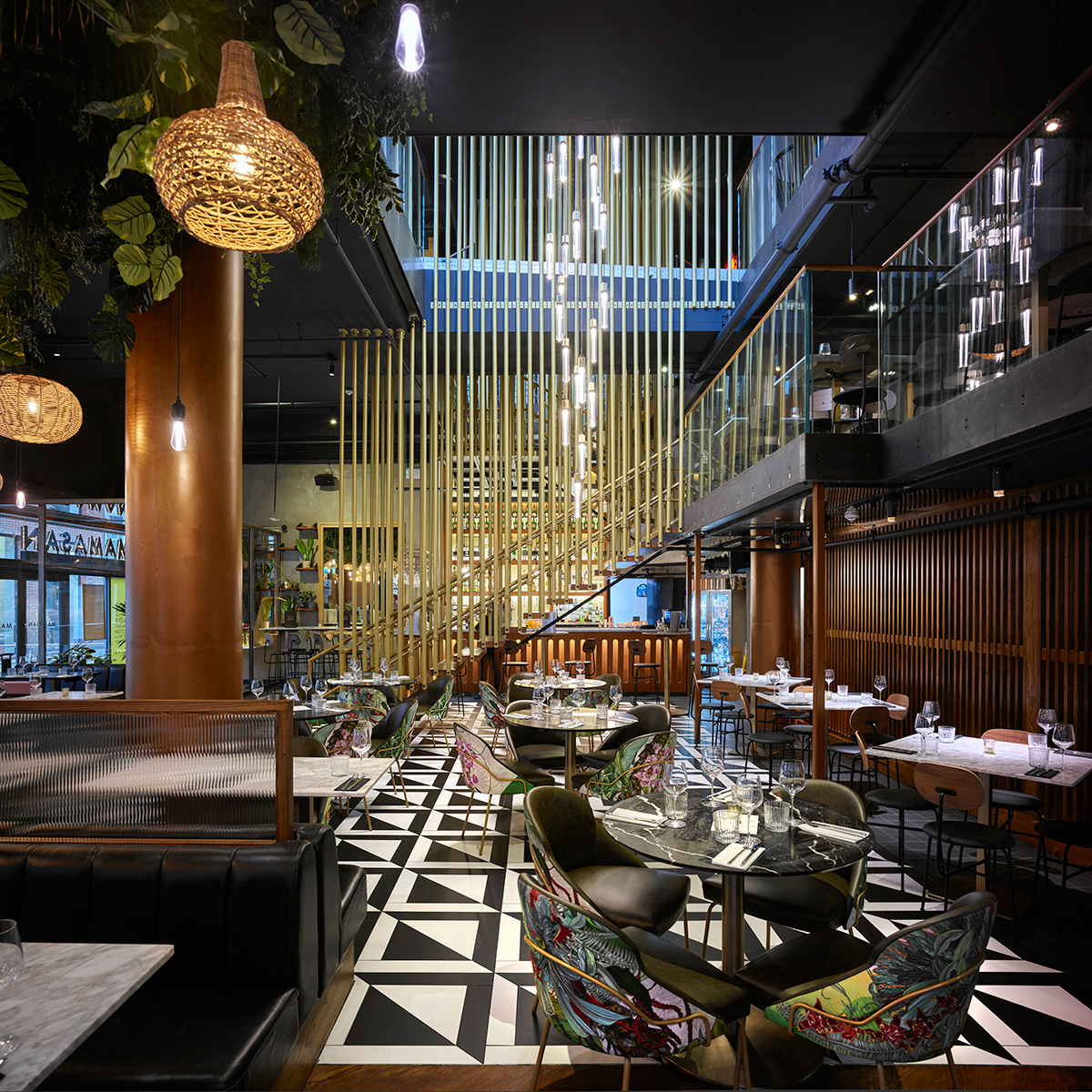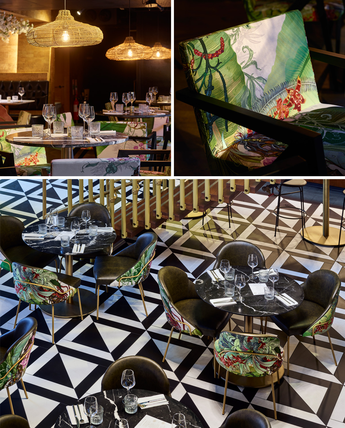 Timorous Beasties’ Topical Tropical linen was used to create bespoke seating within the restaurant and echo the canopied tangles of foliage framing the ceilings above. The contrast of the monochromatic, geometric flooring adding to the drama and allowing the festoons of flora and fauna from the fabric design to truly sing.