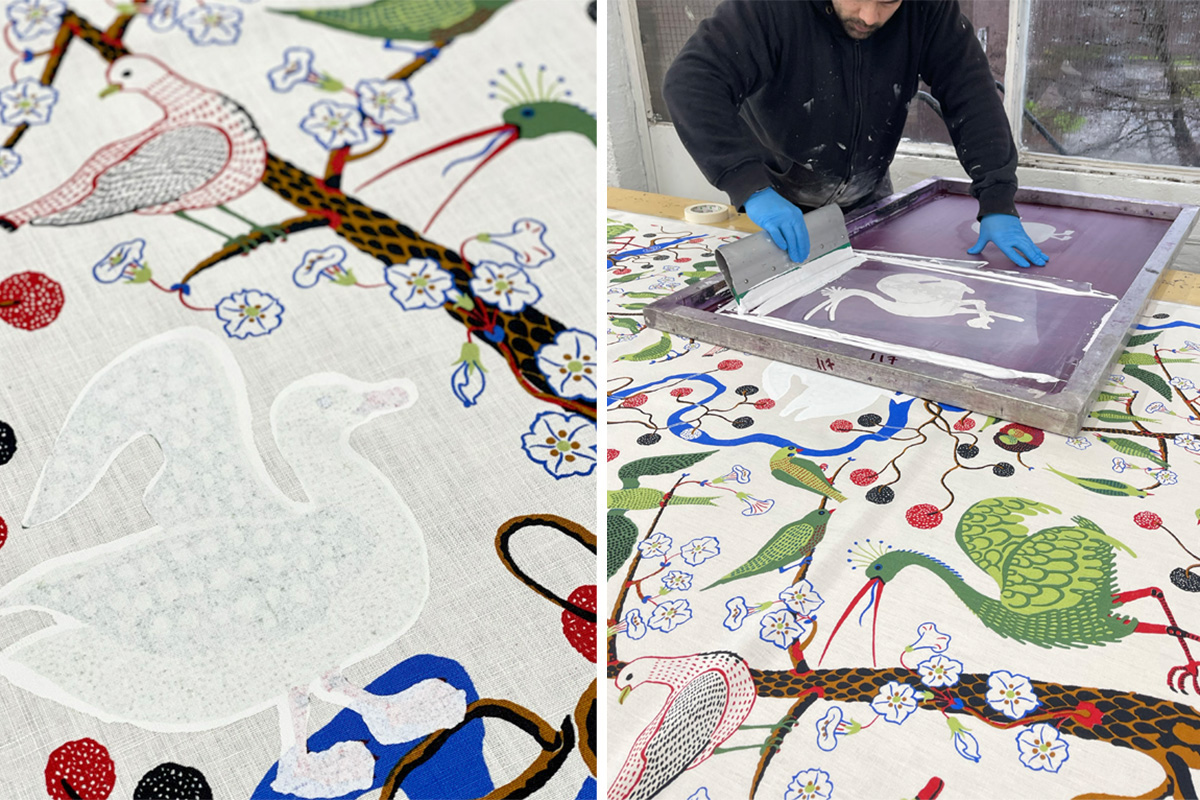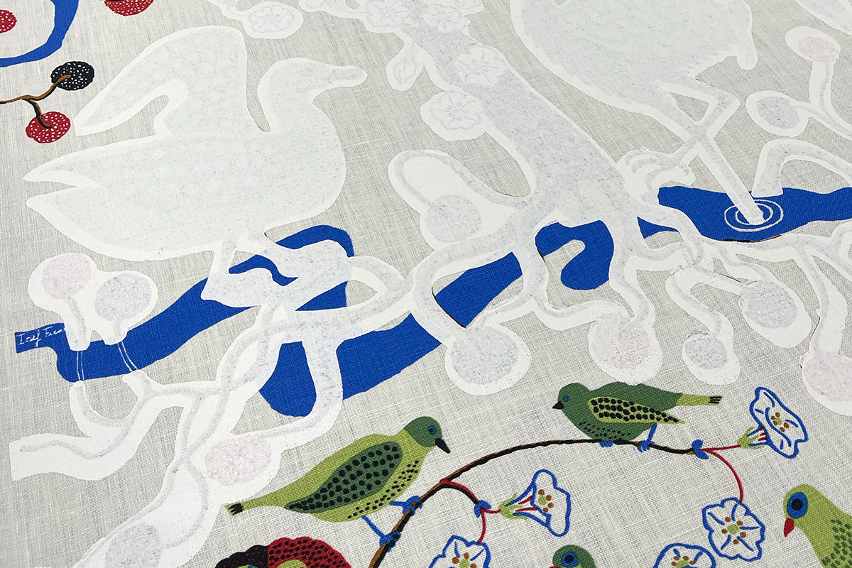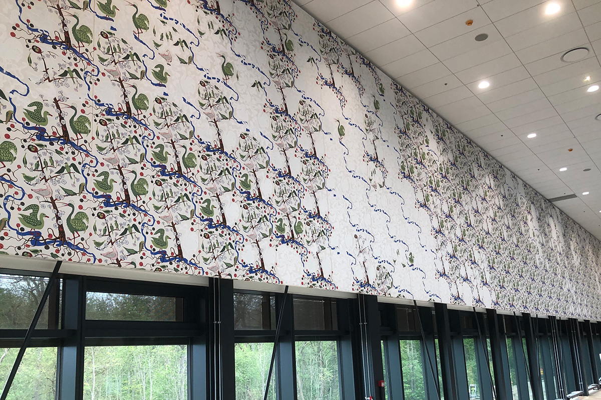 Starting with the base of ‘Grona Faglar’, selected birds and foliage were blocked out with a handprinted unique opaque overprint. Featuring 30 panels in total, each measuring 4 metres in length, the panels were turned into screens for a Copenhagen hospital in an ode to Frank's classic design.